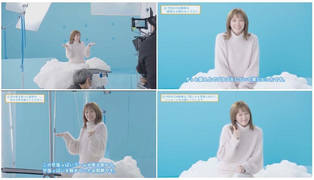 雲型の椅子に座りながら、終始にこやかな様子で撮影に臨んでいました。また、雪の宿を笑顔で頬張るシーンなどもあり、和気藹々としたCM撮影の現場でした。