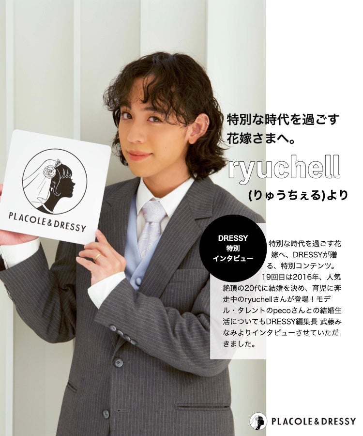 特別な時代を過ごす花嫁へ、DRESSYが贈る、特別コンテンツ。第19回目は2016年、人気絶頂の20代に結婚を決め、育児に奔走中のryuchellさんが登場!モデル・タレントのpecoさんとの結婚生活についてもDRESSY編集長 武藤みなみよりインタビューさせていただきました。
