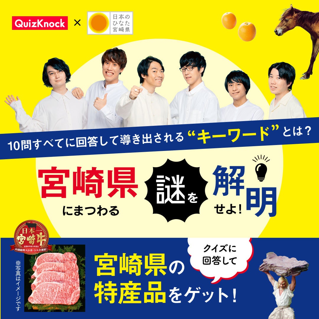 クイズ王・伊沢拓司が率いる東大発の知的メディア「QuizKnock」から、“宮崎愛”を試される10問のクイズが出題されます。すべてを回答し、正しいキーワードを導き出して応募すると、抽選で合計30名の方に宮崎県の特産品をプレゼントします。