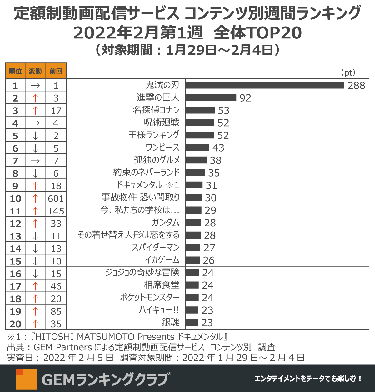 エンタテイメント業界に向けたデータ×デジタルマーケティングサービスを提供するGEM Partners株式会社(ジェムパートナーズ、所在地:東京都港区、代表取締役:梅津文)は2月10日(木)、エンタメコンテンツランキングやデータ情報を発信する「GEMランキングクラブ」プロジェクトにて作成した2022年2月第1週の「定額制動画配信サービス コンテンツ別週間ランキングTOP20(実査日:2022年2月5日、調査対象期間:1月29日~2月4日)」を発表します。