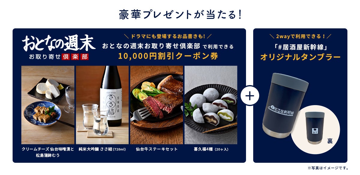 ドラマに登場するお品書きの中で、お好みの推しな書きをTwitterで投稿すると毎週5名、計20名様に『おとなの週末 お取り寄せ倶楽部』で利用できる“10,000円割引クーポン券”とオリジナルの“2Wayで使える「#居酒屋新幹線」オリジナルタンブラー”が当たる!