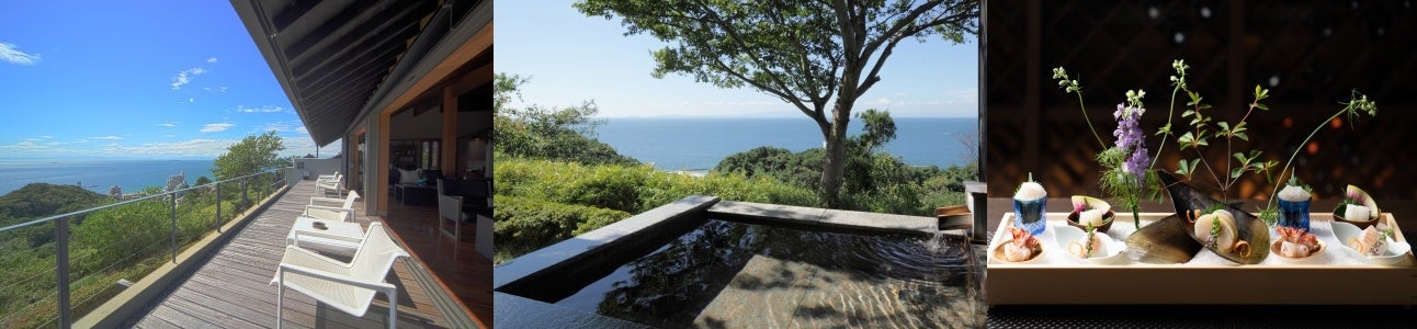 全室露天つきの客室からは水平線が弧を描く伊勢湾を一望できる、高台からの絶景宿。日本酒を味わいながら和食の創作料理による味のおもてなしで、日々の喧騒から遠く離れて、心身のリラックスを。