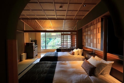 国宝犬山城と木曽川の眺望が広がる全室スイートルーム、半露天風呂付きのモダンな客室。四季を感じる旬の御食事をご堪能いただきながら、ゆっくりと流れるおとなの時間を日本酒とともにお愉しみください。