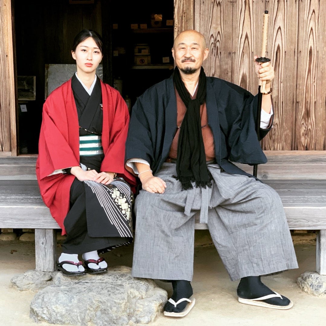 娘(三女)24歳と古民家の縁側で撮影。一緒に剣術の稽古をしております。