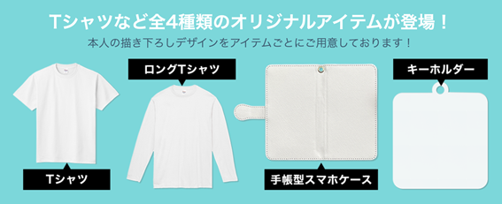アイテムの種類は、Tシャツ、ロングスリーブTシャツ、手帳型スマホケース、キーホルダーの4種類で、アイテムごとに異なったデザインがされています。