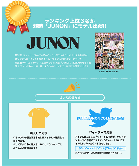 販売ランキング上位3名は雑誌「JUNON」の2022年9月号にモデルとして出演が予定されています。イベントには事前の登録は不要で基本的には”アイテムを購入”することでランキングのポイントが加算されます。また”ツイートで応援”する方法もあり、誰でも手軽に参加することができます。