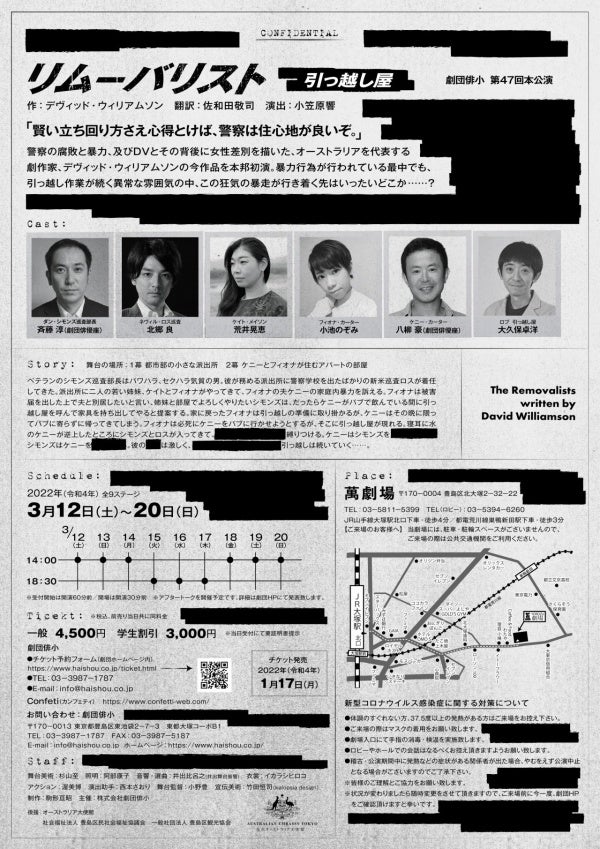 劇団俳小第47回本公演「リムーバリストー引越し屋ー」が2022年3月12日(土)~3月20日(日)に大塚 萬劇場(東京都豊島区)にて上演されます。チケットはカンフェティ(運営:ロングランプランニング株式会社、東京都新宿区、代表取締役:榑松 ⼤剛)にて発売中です。