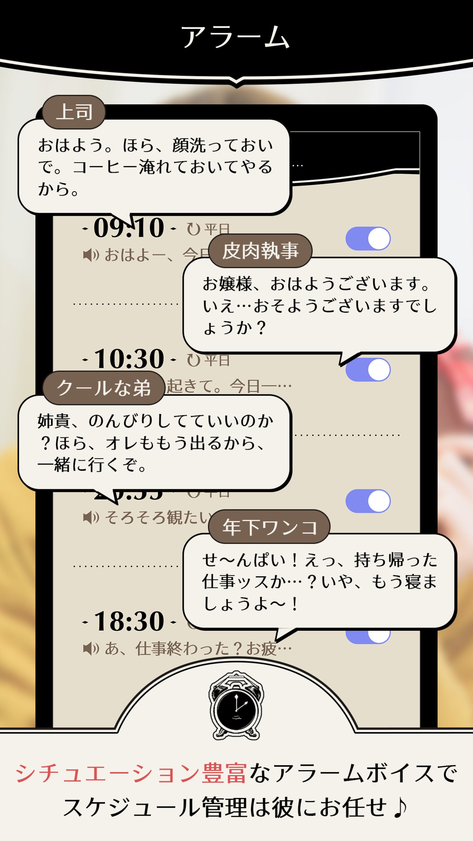 定期的にアラームボイスが配信されます。本人の日常ボイスのほかにも、さまざまなキャラクターやシチュエーションを搭載! 目覚ましとして普段使いにも最適!