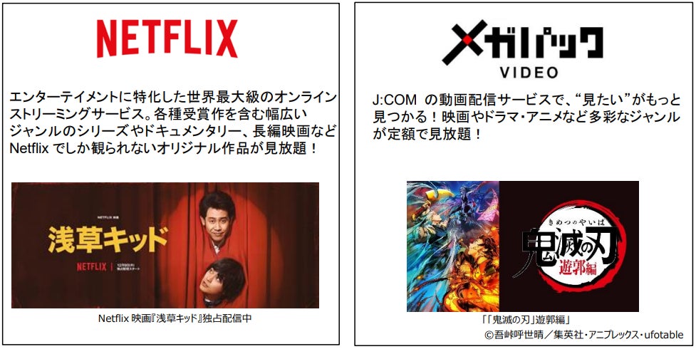 「お得NET」など対象の「J:COM NET」とあわせて、エンターテインメントに特化した世界最大級のオンラインストリーミングサービス「Netflix」または、J:COMが提供する、映画やドラマ・アニメなど多彩なジャンルが定額で見放題の動画配信サービス「メガパック」をご契約いただくことで、「J:COM LINK mini」を無料*2でレンタルいたします。