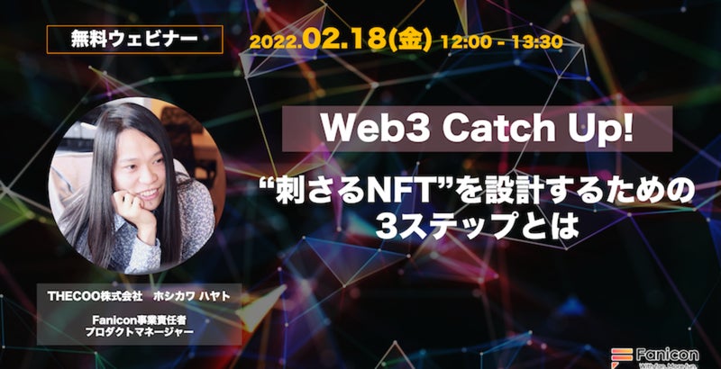 会員制ファンコミュニティプラットフォーム「Fanicon」を運営するTHECOO株式会社(本社:東京都渋谷区、代表取締役CEO:平良真人、証券コード:4255)は、2022年2月18日(金)12:00~13:30、エンタメ業界関係者に向けたWeb3 Catch Upセミナー「“刺さるNFT”を設計するための3ステップとは」を開催いたします。