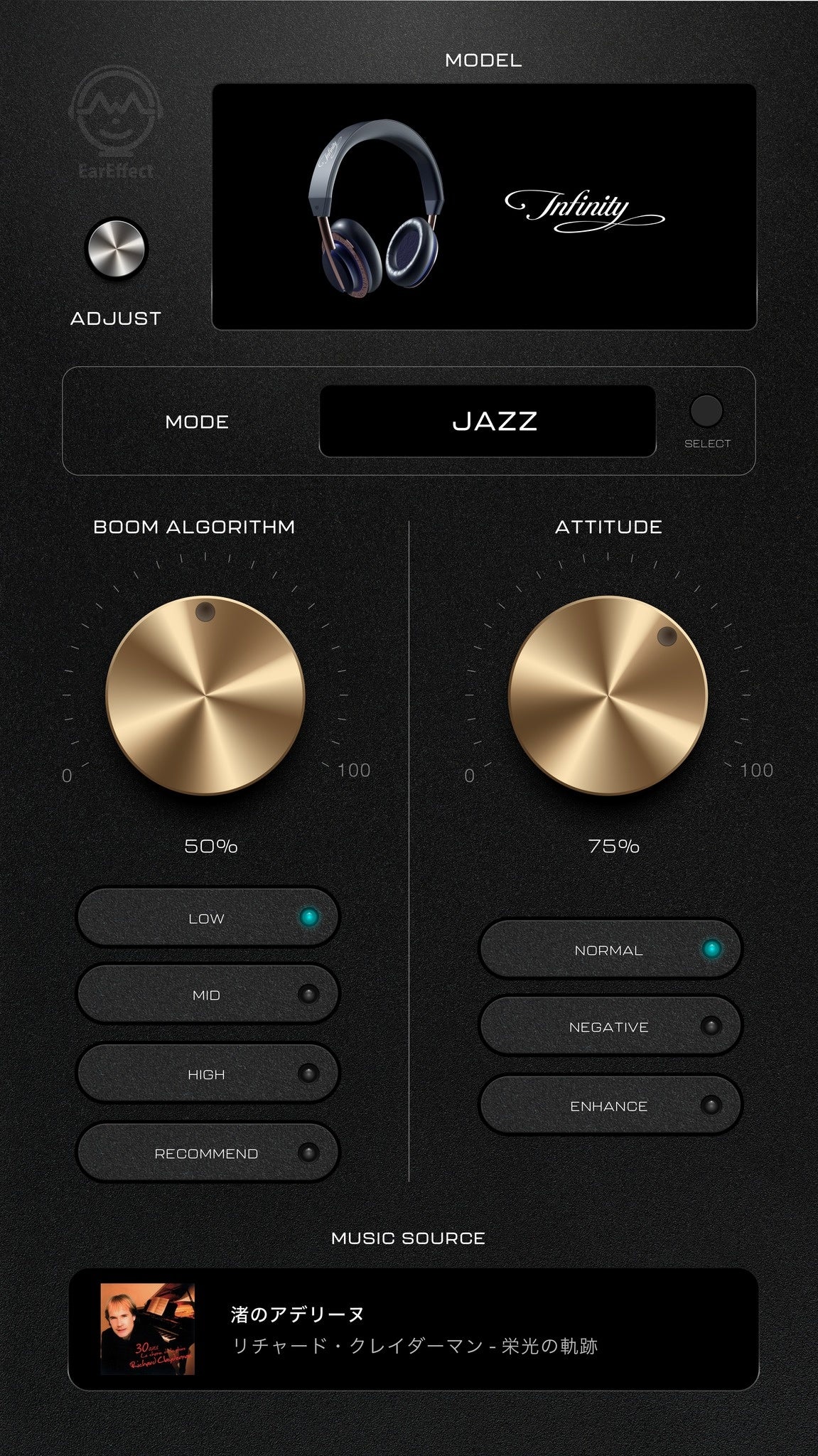 ユーザーはEarEffectにより提供されるプリセットを使用しての音楽視聴はもちろんのこと、プリセットを起点として、Boom Algorithm(低音域の調整機能)とAttitude(音の明瞭度の調整機能)を使用して更に好みの音質へカスタマイズすることが可能です。更には音楽視聴に加え、映画視聴・ゲームに最適化された20種類を超えるプリセットが各モデルに対し提供される予定で、音楽では主にクラシック、イージーリスニング、ポップス、ロック、メタル、R&B、ファンク。そして映画においては、MARVELやUniversalなど制作会社による違いをリカバリーするとともに、ゲームモードにおいてRPGやレースなど種類別にプリセットを用意し、音を使用するあらゆるシチュエーションにてご使用いただけます。