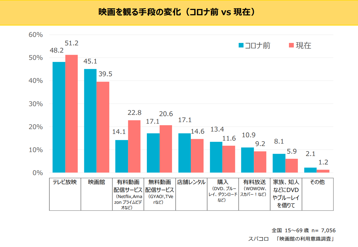 利用率の上位から「テレビ放映」51.2%、「映画館」39.5%、「有料動画配信サービス」22.8%、「無料動画配