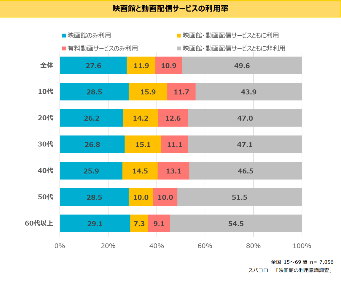 映画館の利用者のうち、およそ4人に1人が動画配信サービスを併用、動画配信サービス利用者の2人に1人が映画館を併用しているようです。また世代ごとの各ポイントの構成比に大きな違いは見られないものの、動画配信サービスの利用率では40代以下でややポイントが高く、50・60代でやや低いことが伺えます。
