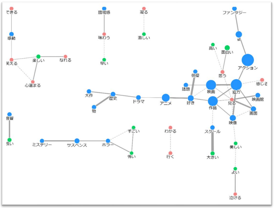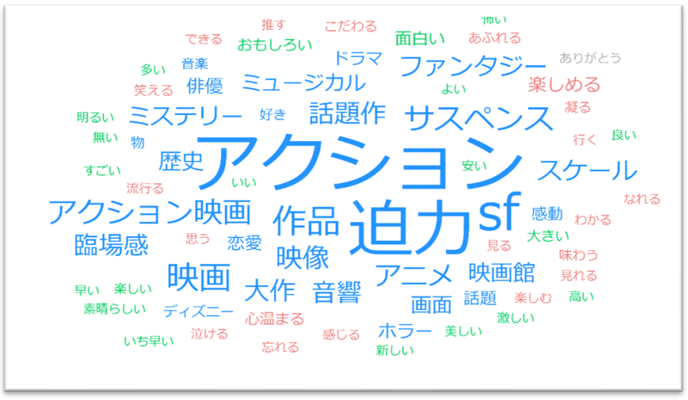 映画館利用者は、どんな作品ならば映画館で鑑賞したいと考えられているのでしょうか?以下は、『コロナ禍の映画館においてみたいと思う作品はどんな作品か?』を聞いた自由回答のスコアが高い単語をユーザーローカル テキストマイニングツールを用いて分析・可視化した図です。( https://textmining.userlocal.jp/ )