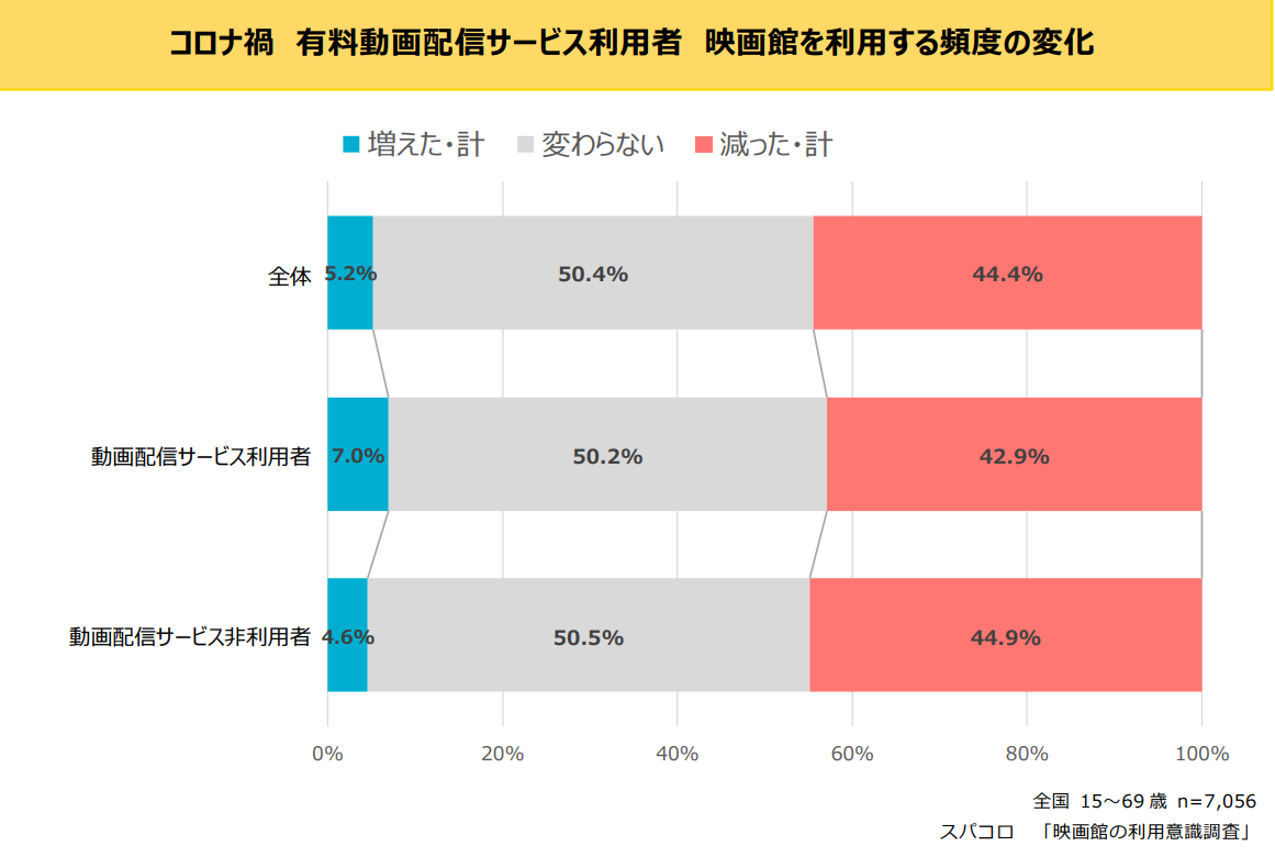 の合計は5.2%、「変わらない」と回答した人は50.4%、「減った」と回答した人の合計は、44.4%という結果に。映画館利用経験者の半数近くがコロナ禍において映画館に行く頻度が下がっていることがわかります。