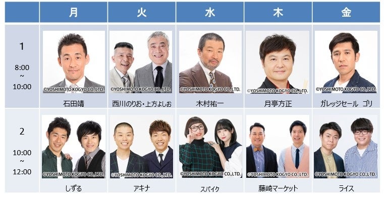 月曜~金曜、チーキーズ キャスト1をあさ8時~午前10時まで、チーキーズ キャスト2を午前10時~ひる12時まで、それぞれ2時間生放送いたします。
