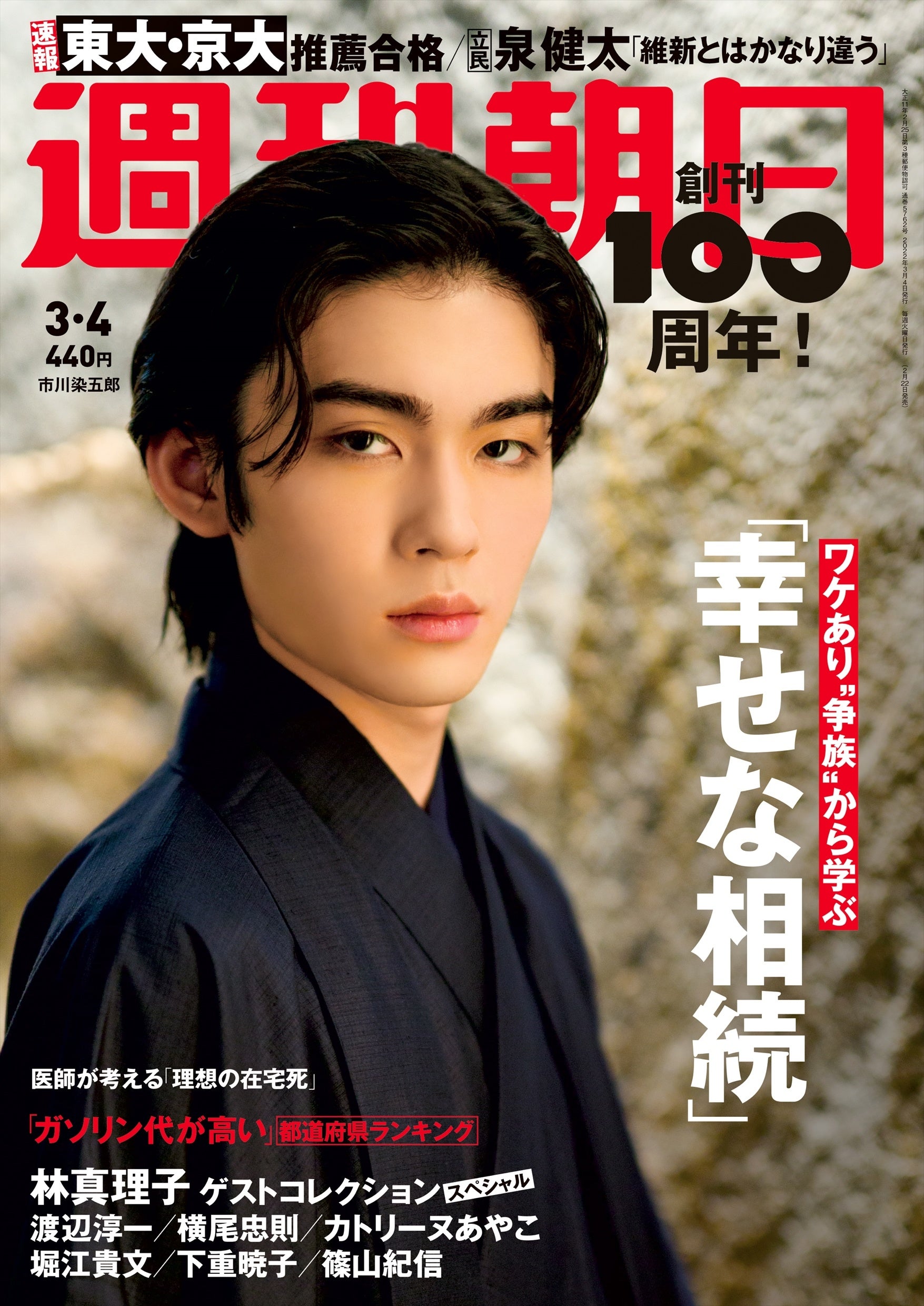 大学受験の合格発表シーズンがやってきました。「週刊朝日」の名物シリーズ「大学合格者ランキング」が、いよいよ今週号からスタートします。初回のランキングは、東京大学、京都大学、難関国立8大学の学校推薦型選抜・特色入試・総合型選抜の結果を合わせて紹介します。「超難関」とされる東大の「学校推薦型選抜」・京大の「特色入試」を突破した「スーパー高校生」たちの素顔に迫った特集も必見です。他にも、相続をきっかけとした兄弟間の争いを防ぐ「“争族”も納得する幸せな相続」、本誌ゆかりの著名人との対談を振り返る林真理子さんの「ゲストコレクション」スペシャル、ガソリン代が高い都道府県ランキング、お好み焼きに欠かせないオタフクソースの誕生秘話など、盛りだくさんのラインナップでお届けします。表紙には気品あふれる佇まいが話題の16歳・市川染五郎さんが初登場です。