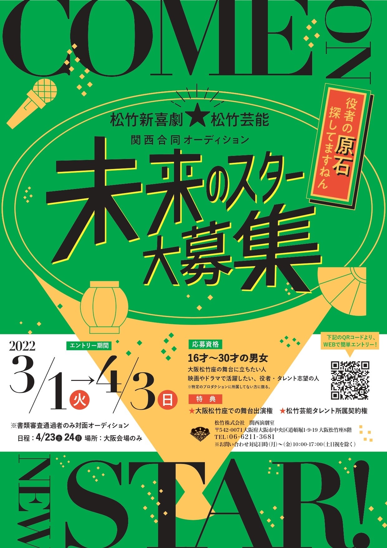 この度、松竹新喜劇と松竹芸能のコラボで関西にて合同オーディションを開催致します!