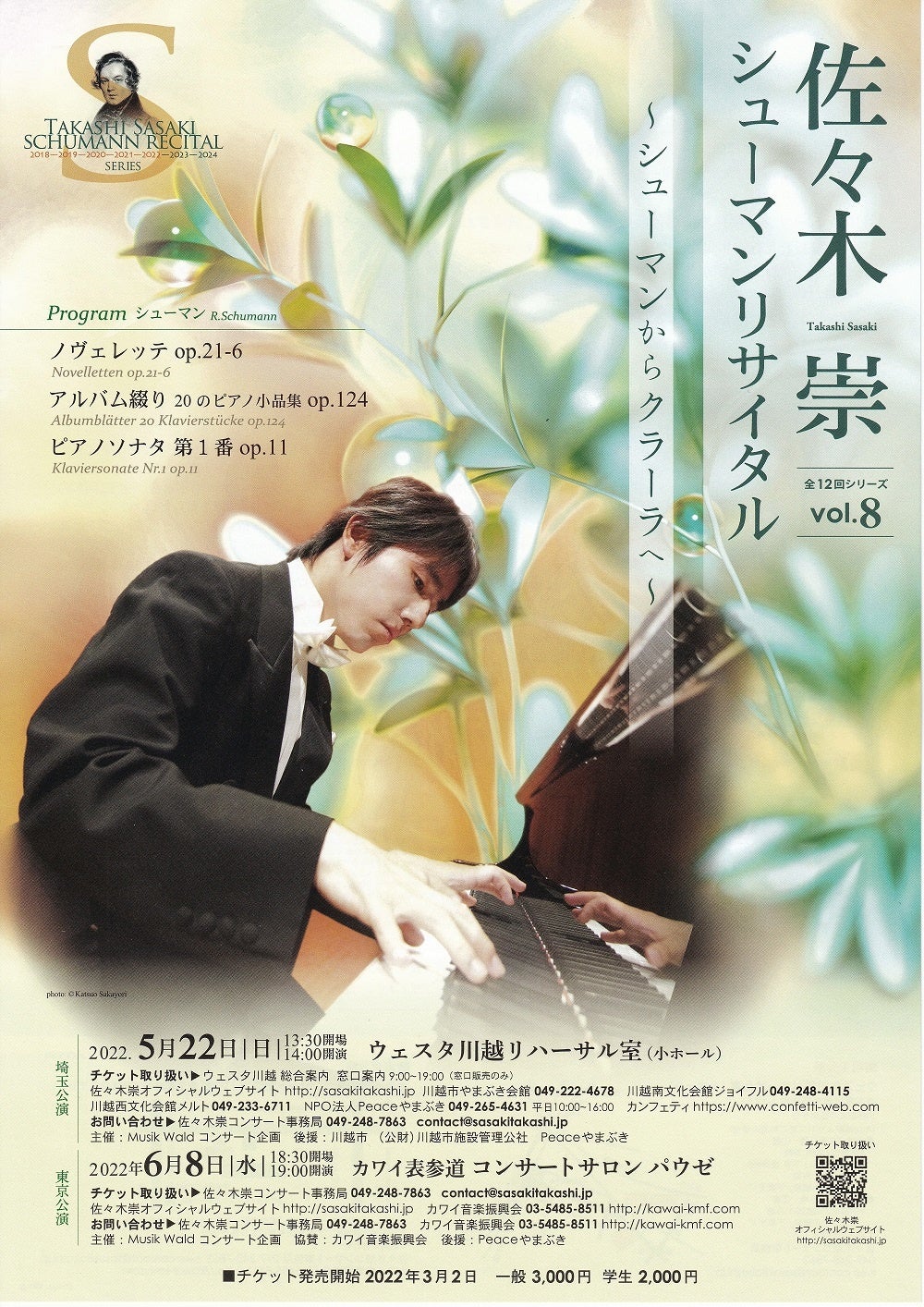 Musik Waldコンサート企画(埼玉県川越市)主催、~シューマンからクラーラへ~『佐々木崇シューマンリサイタルVol.8(全12回)【埼玉公演】』が2022年5月22日 (日)にウェスタ川越リハーサル室(小ホール)(埼玉県川越市)にて上演されます。チケットはカンフェティ(運営:ロングランプランニング株式会社、東京都新宿区、代表取締役:榑松 大剛)にて3月2日(水)より発売開始です。