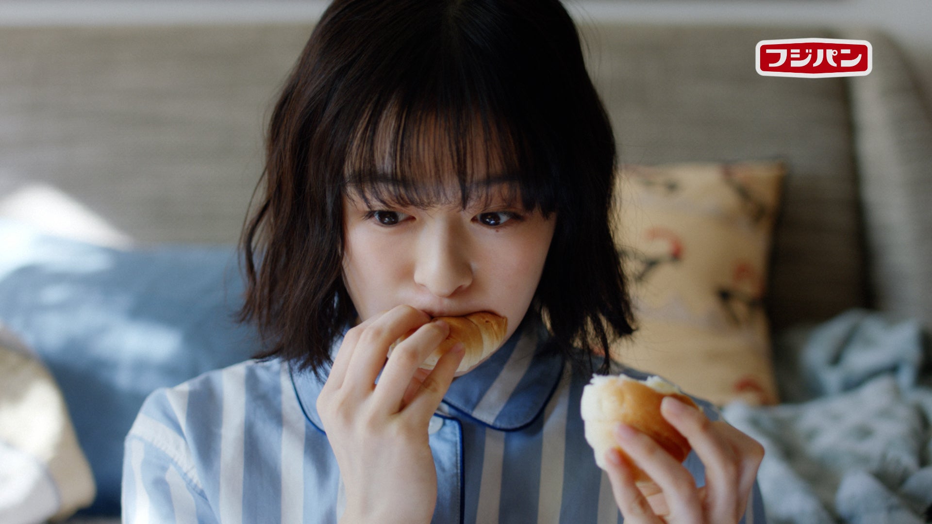 2. ネオバターロールをおいしそうにほおばる笑顔のシーンでは、「ネオバターロール」のやわらかさや、やさしく、親しみのある世界観と重なり、思わず安心感に包まれます。