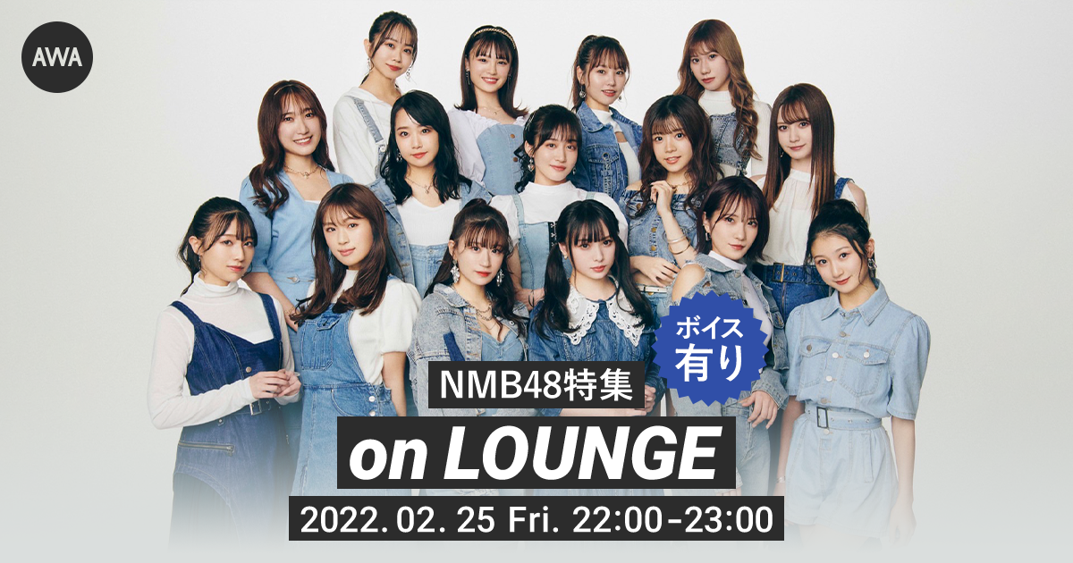 AWA株式会社(本社:東京都港区、代表取締役CEO:冨樫晃己)が運営する、サブスクリプション型(定額制)音楽ストリーミングサービス「AWA(アワ)」は、2022年2月25日(金) 22:00~23:00の60分に渡り、オンライン空間「LOUNGE(ラウンジ)」で、NMB48の特集LOUNGEを開催いたします。