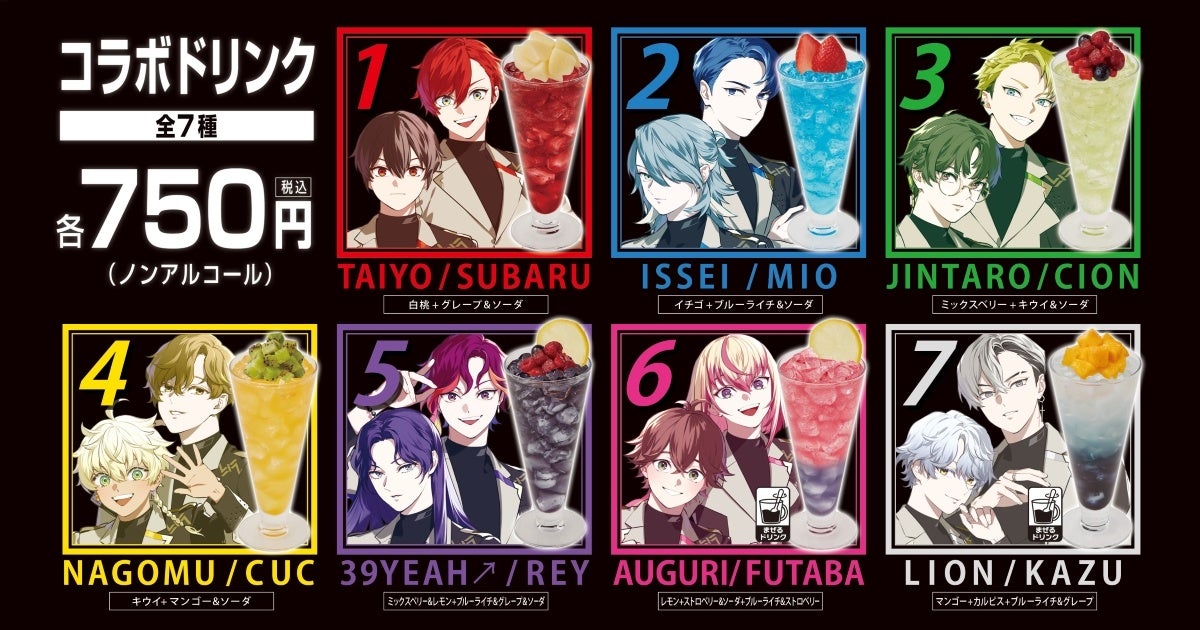 コラボドリンクには、「VS AMBIVALENZ」のキャラクターをイメージした全7種をご用意します。注文特典として、コラボドリンク1品ご注文につき、オリジナルコースターを全15種の中からランダムで1枚プレゼントします。