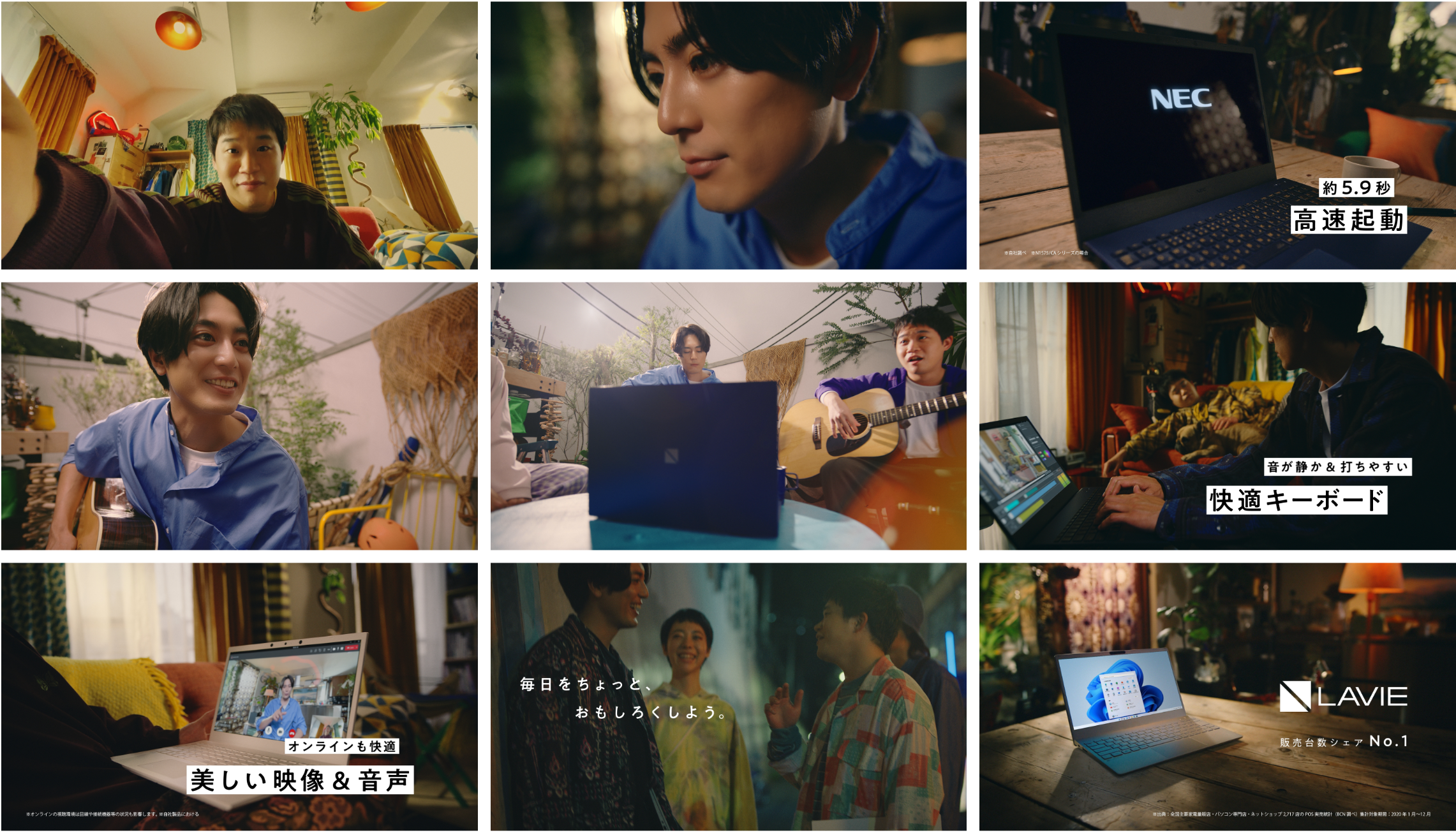 第一弾では間宮さんがLAVIEのノートパソコンを持っている設定だったところ、今回は矢本さんも新しく使い始めた設定。パソコンを起動する矢本さんの表情からCMがスタートし、「新しい何かがはじまるとき、そこにLAVIEがいる。」という間宮さんのモノローグが入ります。LAVIEに向き合う間宮さん、友人たちとのギターセッション。楽しげな日常のシーンに「いつもの景色も、はじめての感覚も、ぜんぶが心地いい」と、間宮さんの落ち着いたナレーションが続いていく…かと思いきや、「心地よすぎて寝てもうたけどな」と、急に矢本さんがカットイン、乗っ取ってしまいます。ナレーションは一転、二人のリアルなやりとりに突入。前作同様、「あらゆるシーンに思いを巡らせ設計されたLAVIE」を感じさせる、快適な日常を描きながらパワーアップした「まみやもと節」で、彼らならではの「ちょっとおもしろい毎日」を余すところなく表現します。