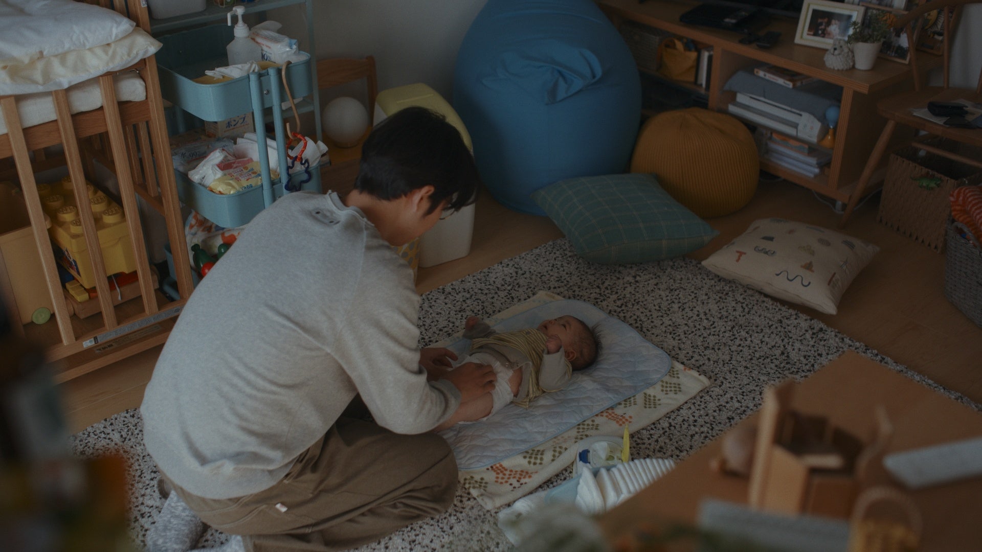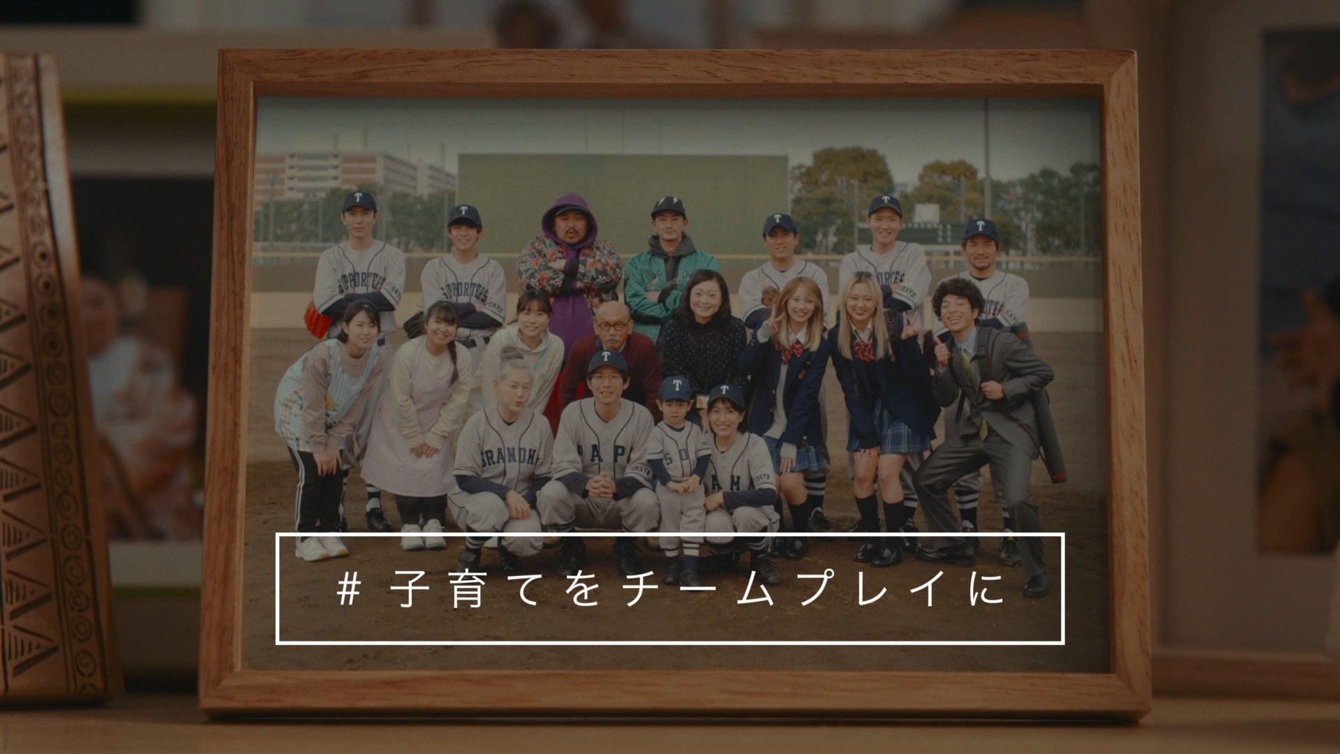 本CMは、共働き夫婦が、初めての「子育て」に戸惑いながらも、家族以外の同僚、街中で一緒になったさまざまな人にも支えられながら、奮闘する姿を、野球の試合に見立てて描いています。
