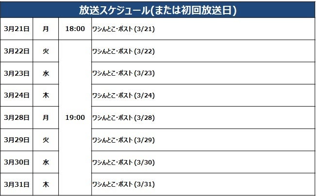 初回放送の3月21日(月)は、18時~21時までの1時間拡大版になります。