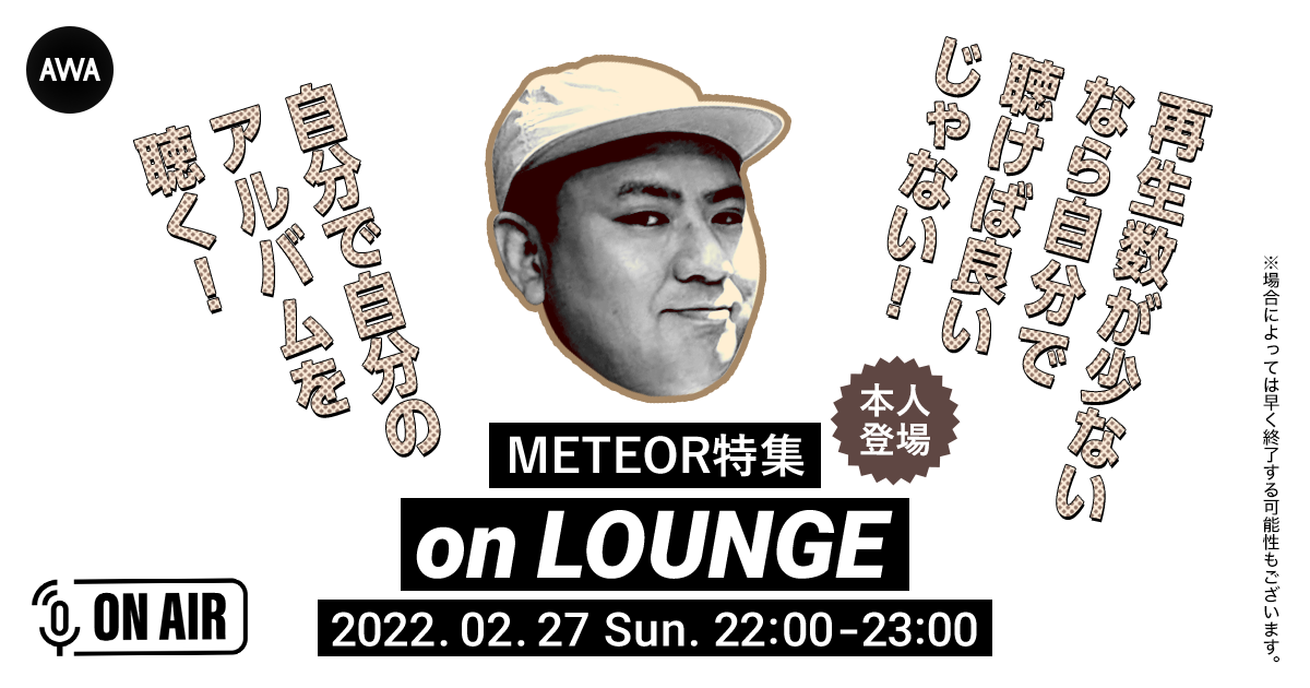 今回のイベントは、AWAのLOUNGE、音声配信機能を使用して、2000年代初頭からラッパーとして活動し、今までも多数の自身の作品をリリース、多くのアーティストの作品にも参加、昨年、放送されたアニメ『オッドタクシー』では、キャラクター・ヤノを演じ、インスパイアされた楽曲の発表など、活躍著しいMETEORとその仲間たちがお送りする濃い目の60分です。LOUNGEは、どなたでも参加することができ、AWAアプリを事前にダウンロードしていれば、アーティストとのチャットでの交流など、よりお楽しみいただけます。ぜひ、METEOR presents 「再生数が少ないなら自分で聴けば良いじゃない!自分で自分のアルバムを聴く!」をお楽しみください。