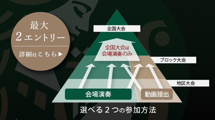 今回から新たに加わる未就学児部門や連弾部門をはじめ、一般部門はプロとアマチュアに分け、各部門のレベルの公平性を担保します。また、「会場演奏」と「動画提出」からエントリー方法を選択可能。全17部門から、自分に合った部門を選んでエントリーすることができます。