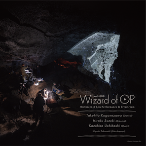 光を生命体のように扱う小金沢健人、光をドローイングの痕跡として捉える鈴木ヒラク、ミクロからマクロまでの宇宙的なサウンドを自由に操る内橋和久の3人が、光の一切届かない地下200mの富岳風穴(山梨県)で無観客でおこなったパフォーマンスの様子を撮影した映像作品「Wizard of OP – 富岳風穴 / Fugaku fuketsu – 」を上映する。 これは現代における洞窟壁画を描く行為の記録映像でもある。