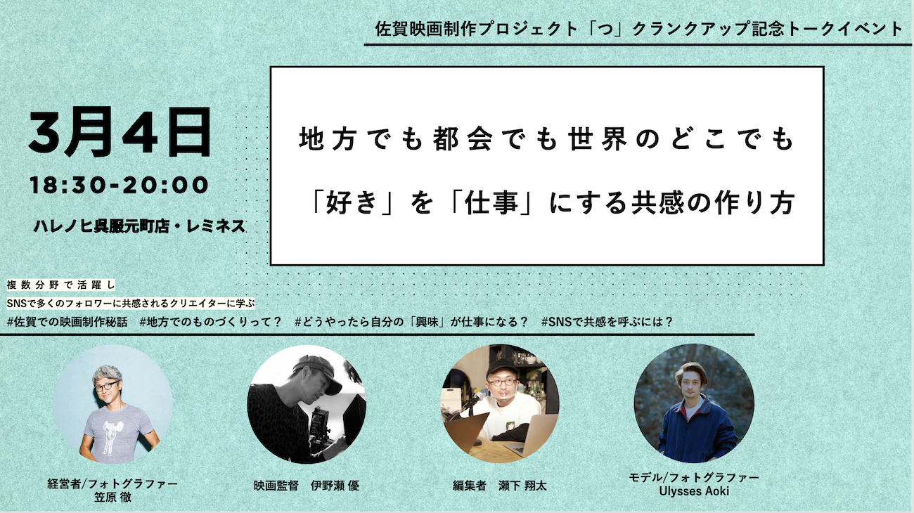 佐賀県の人・魅力を発掘し、発信、強化する佐賀映画制作プロジェクト「つ」が、3月2日にクランクアップいたします。撮影完了を記念して、2022年3月4日(金)18時30分より「ハレノヒ呉服元町店・レミネス」にてトークイベントを行います。監督の伊野瀬優、総合プロデューサーの笠原徹が登壇。撮影時のエピソードトークや、「地方でものづくりをすること」「好きを仕事にするということ」についてお話しします。https://forms.gle/mLoTpuuJUYpMD9os9