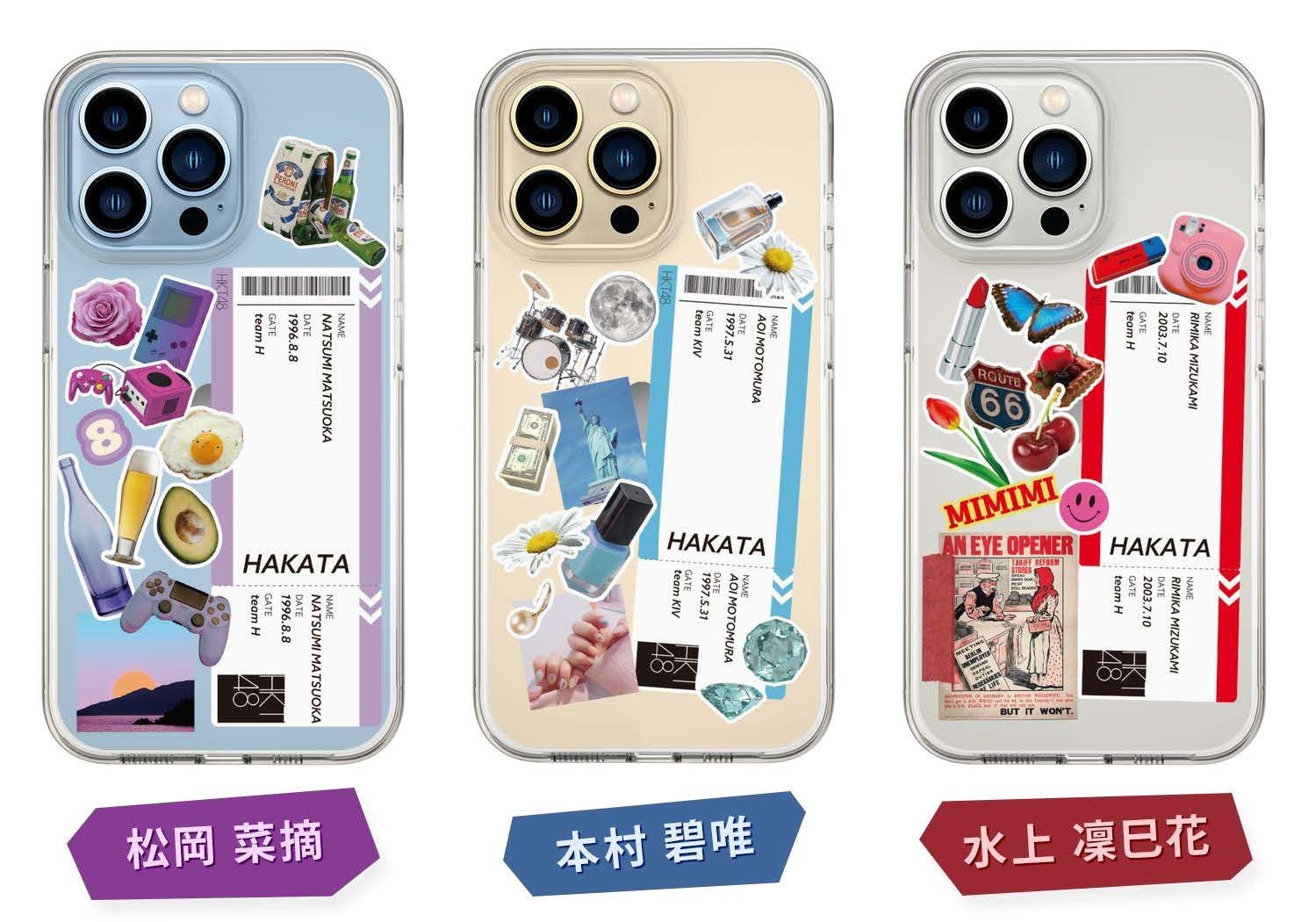 今回、松岡 菜摘・本村 碧唯・水上 凜巳花の3人がHKT48のオリジナル劇場チケットをベースにしたスマホケースをプロデュース。3人の好きなモチーフが詰まった男女が楽しめるスクラップ風デザインになっています。