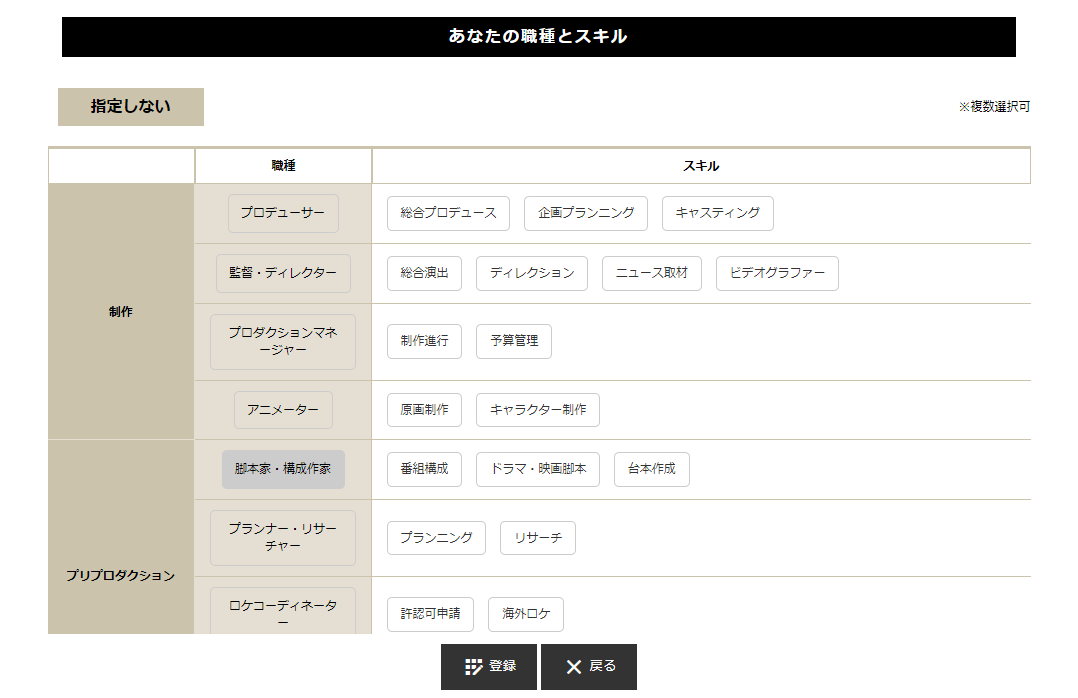 映像クリエイターの職種は多岐にわたります。プロデューサー、ディレクター、カメラマンをはじめ、エディター、CGデザイナー、VRクリエイター、ビデオエンジニア、MAミキサーなど多様な職種とスキルを登録することができます。また制作実績のあるメディアや得意ジャンルの登録など詳細なプロフィールが掲載されます。