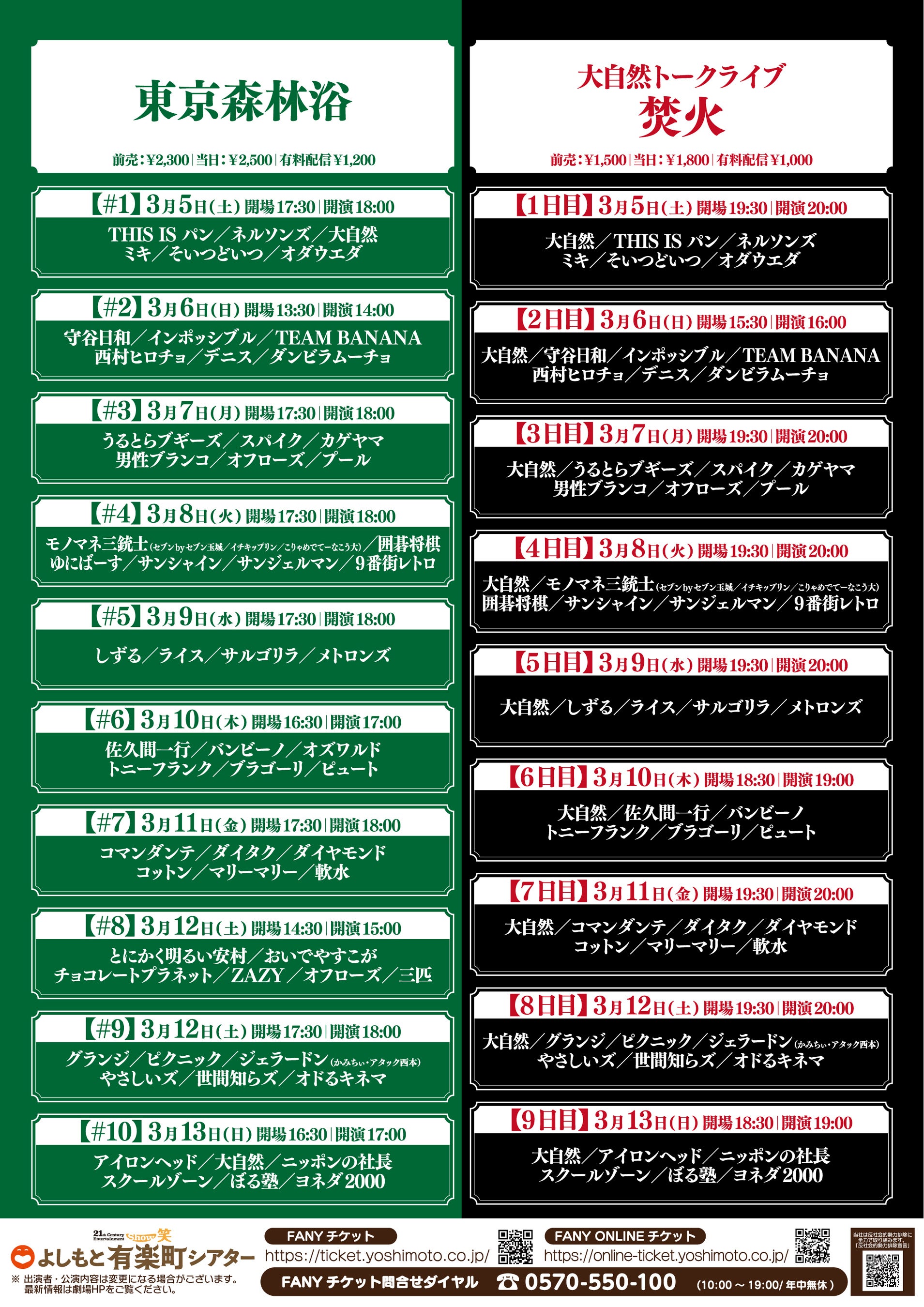 また、『東京森林浴』には全56組の芸人が、『大自然トークライブ「焚火」』にはMC大自然を含めた全43組の芸人が日替わりで登場いたします。こだわりのセットの中で、普段とは一味違う芸人たちの姿をお楽しみください!