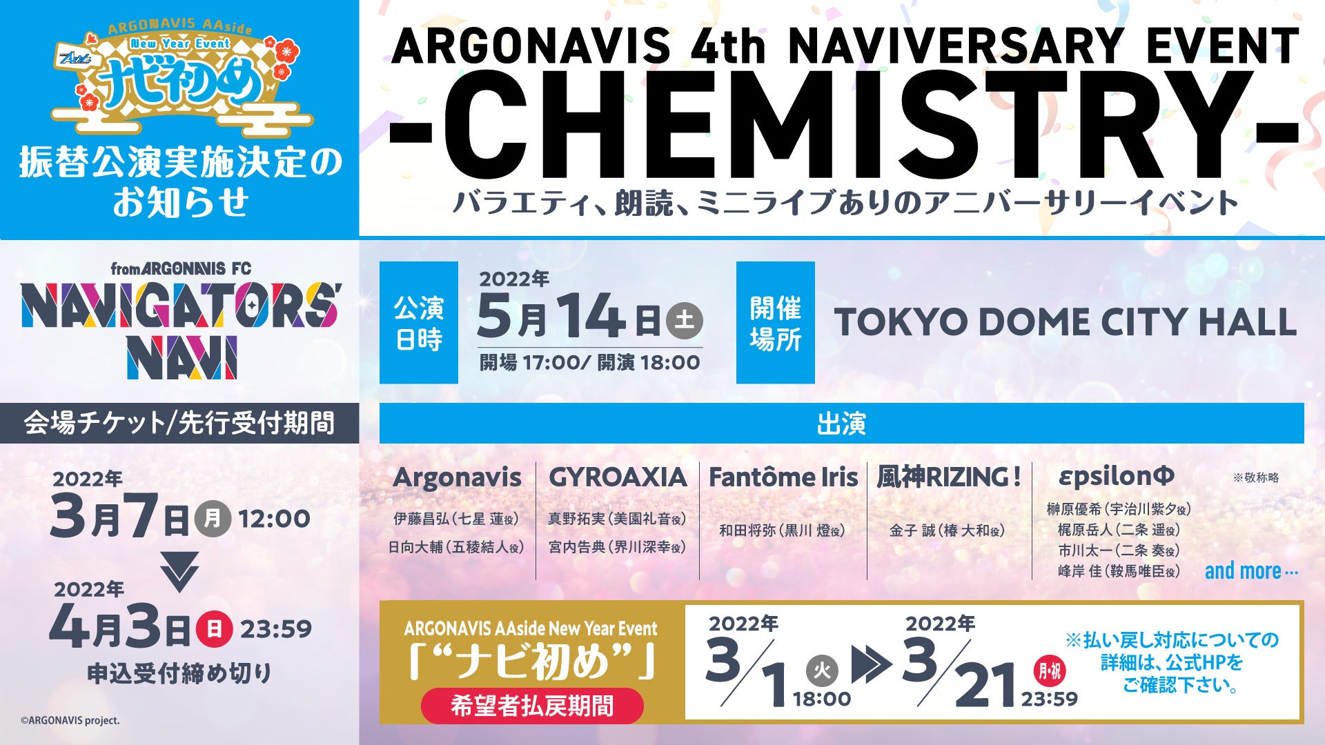 「ARGONAVIS 4th NAVIVERSARY EVENT -CHEMISTRY-」は、プロジェクト4周年を記念した豪華キャストによる、バラエティ・朗読・ミニライブありのアニバーサリーイベント。2021年1月9日(土)開催を予定しておりました「ARGONAVIS AAside New Year Event “ナビ初め”」の振替公演として実施いたします。