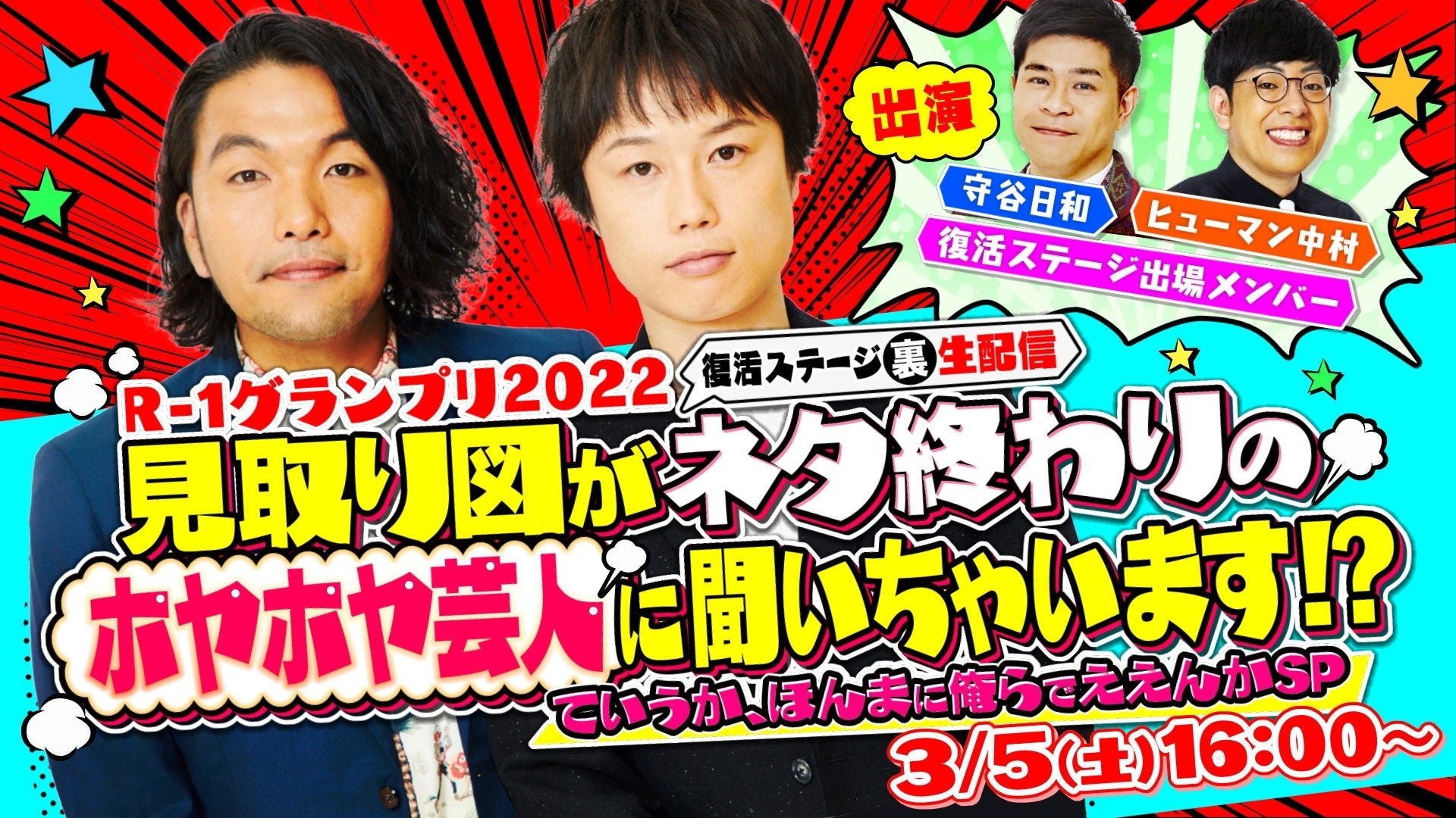 - R-1グランプリ2022 復活ステージ裏生配信 ~見取り図がネタ終わりのホヤホヤ芸人に聞いちゃいます!?ていうか、ほんまに俺らでええんかSP~