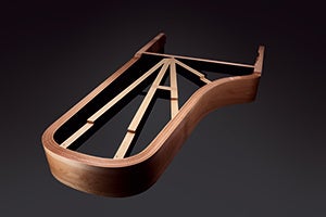音の伝わり方に大きく影響する曲練支柱には、音質に温かみと深みが出るブナ材とマホガニー材を使用し、一体となって振動をスムーズに伝えることができるように設計しました。さらに、当社独自の木材改質技術「A.R.E.」(※1)を施すことで振動減衰の抑制に成功しました。骨組みとなる直支柱は、緻密な機械加工の後、手作業による最終調整を行い、曲練支柱の状態に合わせて隙間なく組み込んでいます。