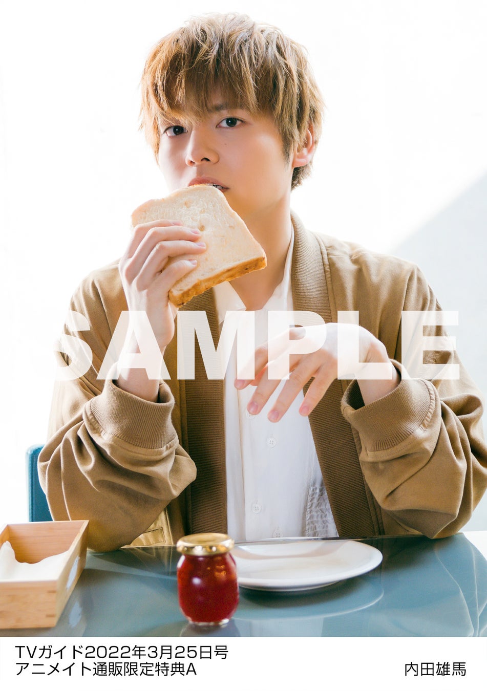 また、アニメイト通販にて「TVガイド関東版2022年3/25号」を購入すると、特典として内田雄馬ブロマイドがプレゼントされる限定企画も。一緒に朝食を食べているような気分になれるショット、眼鏡を掛けて微笑んでいるカット、飲み物を注いでいたり、読書をしているポーズなど、全4種類の絵柄のなかから1枚を選ぶことができる。