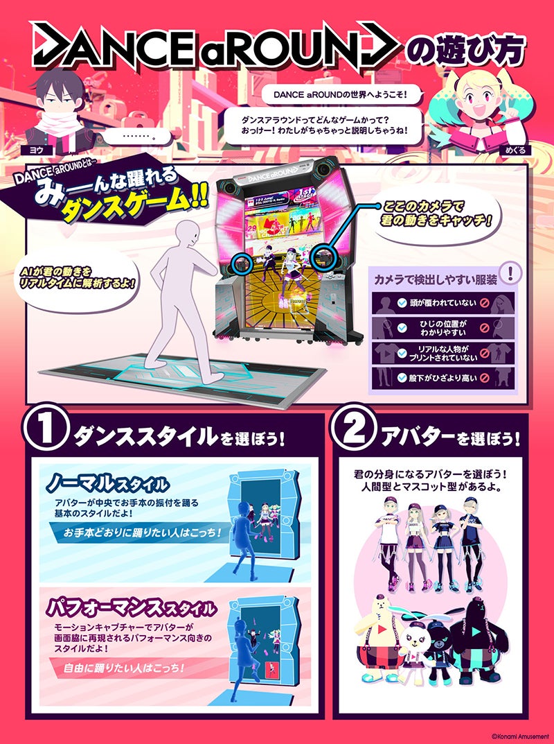 『DANCE aROUND』は、タイムラインに流れてくる動きのイメージに合わせて踊る、BEMANIシリーズ最新のダンスゲームです。プレーヤーのダンスは筐体に搭載されているカメラで読み取り得点に反映されます。