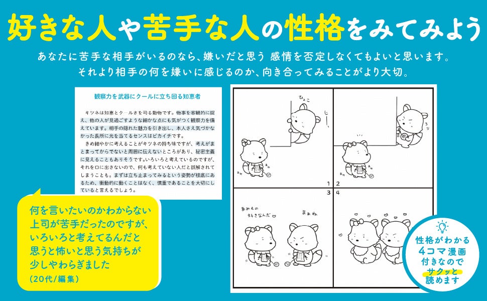 「負けず嫌いのキツネ」や「さみしがりのパンダ」、「わが道をいく鳳凰」など、少しへんてこ、でもとても可愛いゆるキャラたちが、繊細でちょっと生きづらさを感じている方たちの背中をそっと押してくれます。