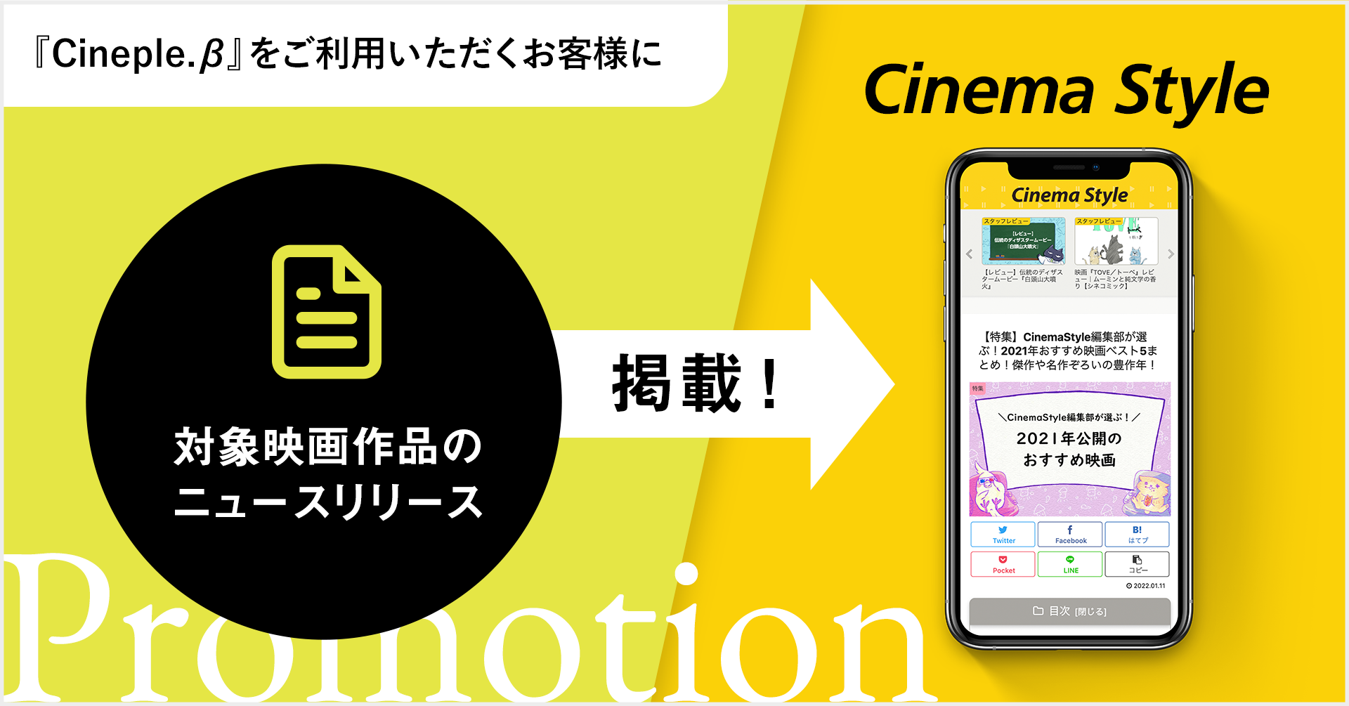 Cineple.βをご利用いただいたお客様に株式会社コンテンツが企画・運営している映画webメディア『CinemaStyle』に対象作品のリリース記事を掲載させていただき、宣伝のお手伝いをさせていただきます。