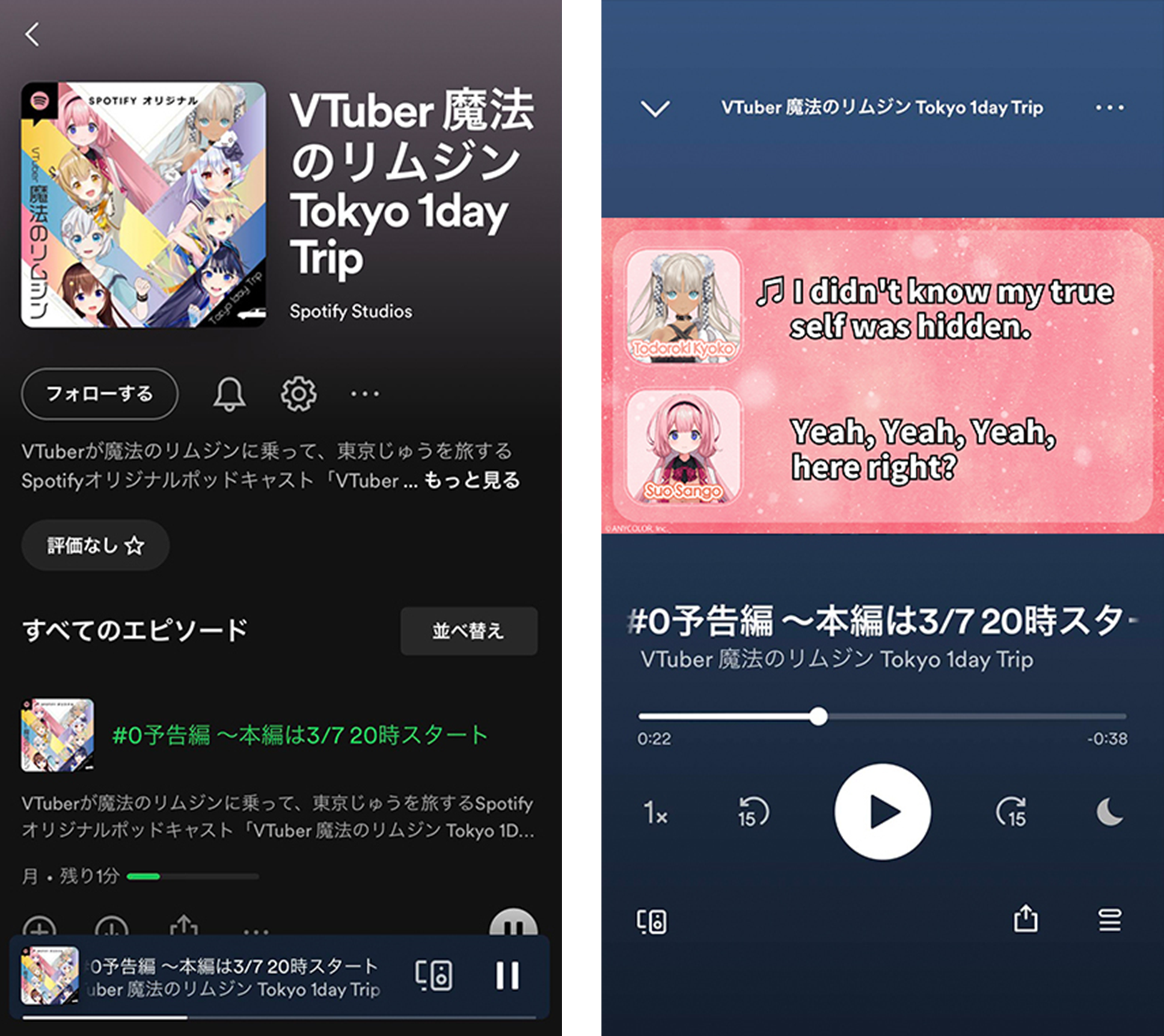 世界で 4億600万人以上のユーザーが利用するオーディオ ストリーミングサービス Spotify(会社名 Spotify AB / 本社 Stockholm, Sweden)は、インターネット上などで2DCGや3DCGで描かれたキャラクターやアバターを用いて動画投稿や生放送を行い、国内だけでなく海外でも人気を集めるクリエイター VTuberが、音声だけで新たなエンタテインメントに挑戦する、Spotifyオリジナルポッドキャスト番組『VTuber 魔法のリムジン Tokyo 1Day Trip』を、本日3月7日より配信いたします。
