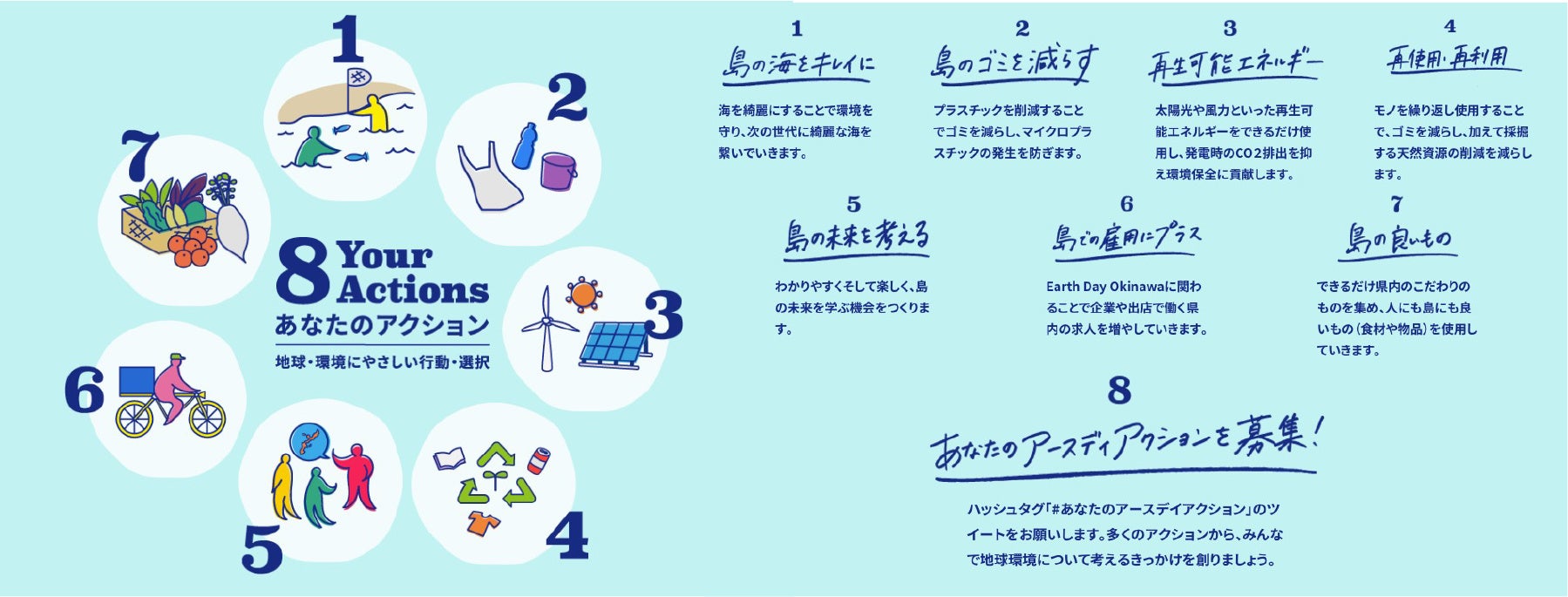 Earth Day Okinawaでは島の未来にためにできることとして7つの項目と、地球環境にやさしい行動・選択を“あなたのアースデイアクション”として加え、8つの項目を大切にしていきます。