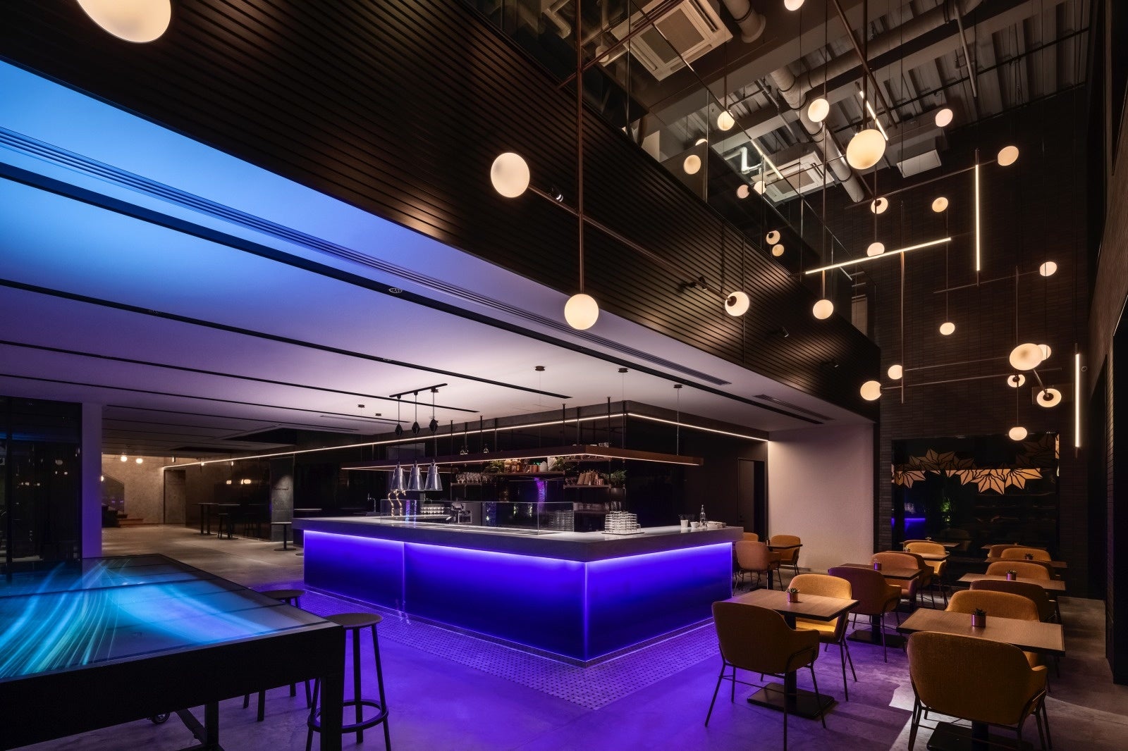 「THE LIVELY 福岡博多」のイベント会場はエントランスを入ってすぐ、数々の照明やサイネージが光る1階ラウンジスペース。普段はチェックインロビーやオリジナルイタリアンをダイニングスタイルで楽しめる「THE LIVELY KITCHEN」、 ホテルの中央に位置する「THE LIVELY BAR」があり、地元の人や観光客で賑わいます。