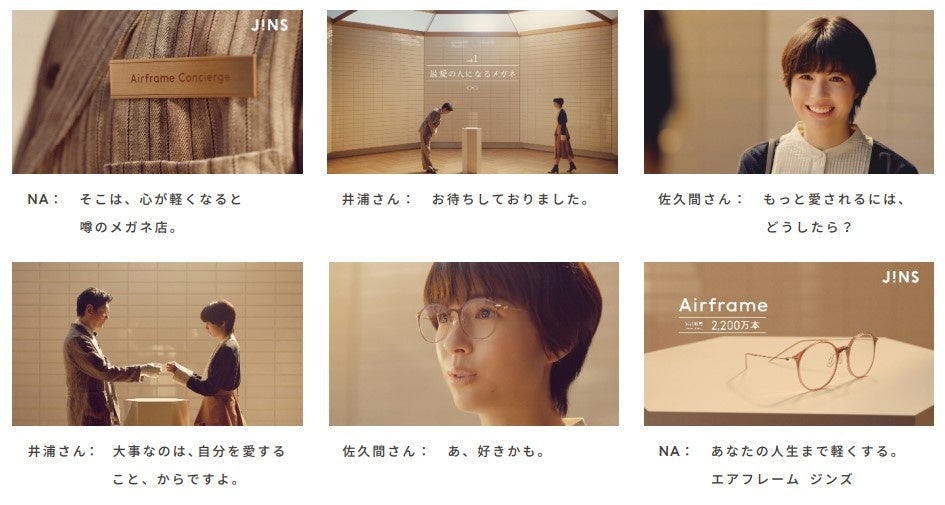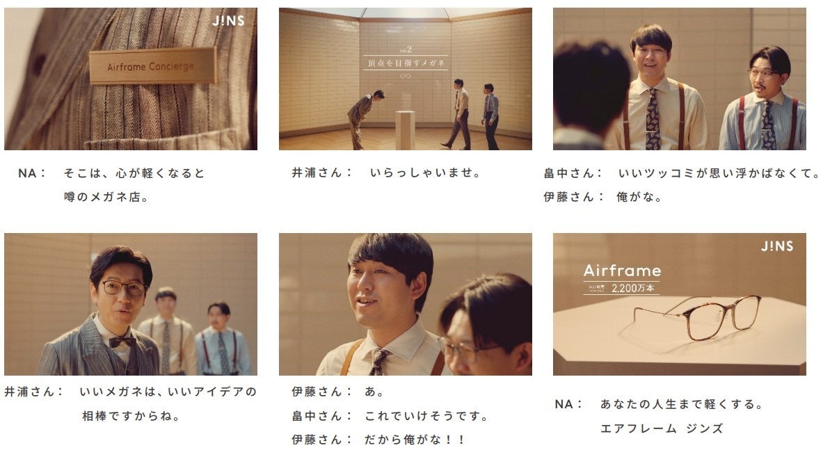 株式会社ジンズ(東京本社:東京都千代田区、代表取締役CEO:田中仁、以下JINS)は、井浦新(いうらあらた)さん、佐久間由衣(さくまゆい)さん、お芸人コンビ・オズワルドさんを起用した、“空気のようなかけ心地”が人気の軽量メガネ「Airframe(エアフレーム)」シリーズのTVCM2篇を、2022年3月12日(土)よりオンエアいたします。