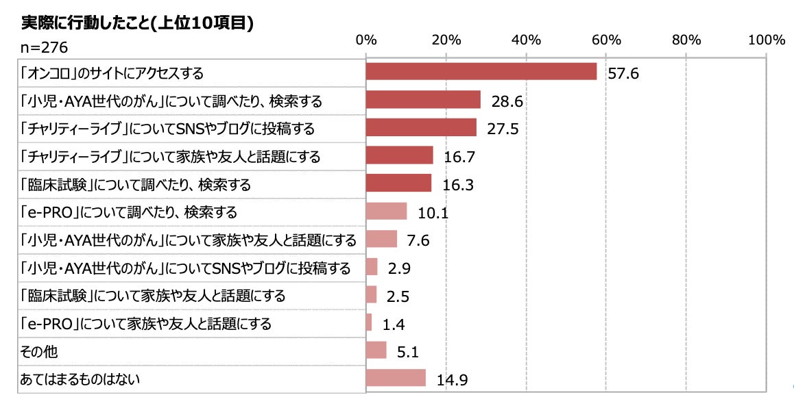 「オンコロのサイトにアクセスをする」がトップ。他にも「小児・AYA世代のがんについて調べたり、検索する」「臨床試験について調べたり、検索する」といった検索が上位に挙がる。