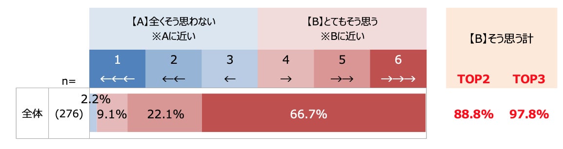 がん疾患啓発をエンターテイメントを用いて行うことについては、TOP3【4-6と回答】で98%の人が有効だと回答している。TOP2【5-6と回答】で見ても89%と高いスコアとなっている。