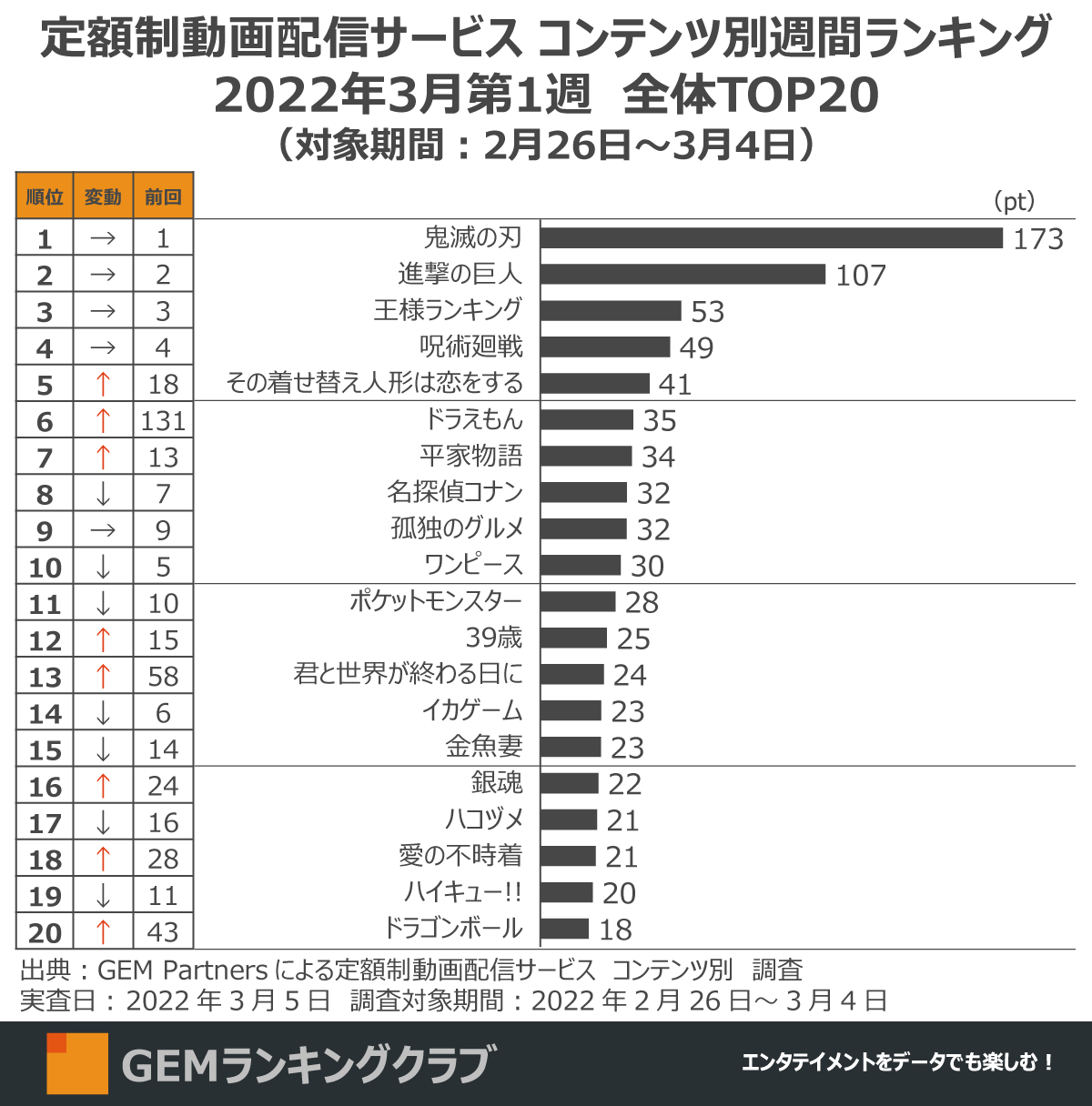 エンタテイメント業界に向けたデータ×デジタルマーケティングサービスを提供するGEM Partners株式会社(ジェムパートナーズ、所在地:東京都港区、代表取締役:梅津文)は3月11日(金)、エンタメコンテンツランキングやデータ情報を発信する「GEMランキングクラブ」プロジェクトにて作成した2022年3月第1週の「定額制動画配信サービス コンテンツ別週間ランキングTOP20(実査日:2022年3月5日、調査対象期間:2月26日~3月4日)」を発表します。